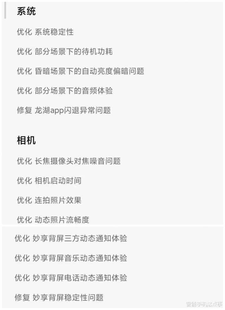 据悉,优化系统稳定性、优化昏暗场景下的自动亮度偏暗问题、优化部分场景下的音频体验、优化部分场景下的待机功耗。