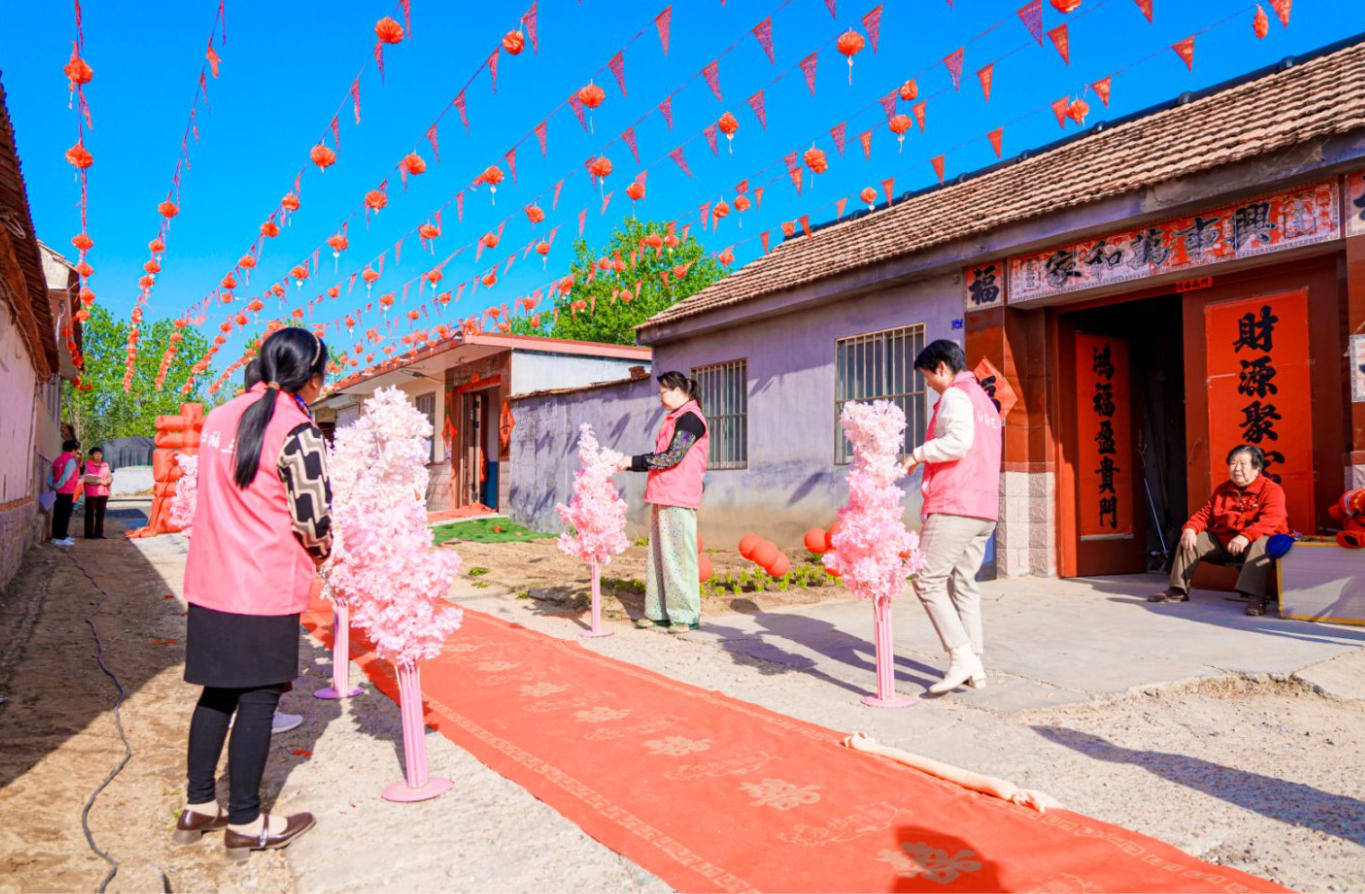 2025年4月,“帮喜团”部分成员在帮助布置结婚场地。(受访者供图)村里曾有一桩因彩礼陷入僵局的婚事。女方家要求18.8万元彩礼和16桌鲍鱼宴,因男方无力承担,导致双方关系紧张。“帮喜团”志愿者陈晓涵带着“双喜鸳鸯”剪纸上门,轻声劝导:“您看这‘囍’字,左右对称才美;婚姻也一样,需要彼此体谅。”队员张洪芬也提着热腾腾的“喜饽饽”来到女方家,以自家经历耐心沟通:“我知道你们不是图钱,是怕孩子受委屈。但真正的疼爱,是让孩子轻装上阵,经营好小家。”