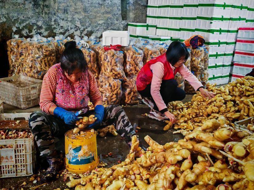 同时,满载生姜的农用车在田埂上穿梭,将一车车“战利品”运往洗姜场。姜场内,姜农与志愿者们正围坐在一起,麻利地对新姜进行去泥、剪秆、分拣,准备发往全国各地。她们的笑声,和着姜块碰撞发出的闷响,奏响了冬日里最动听的“丰收协奏曲”。