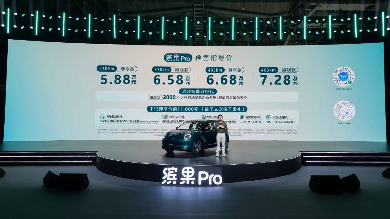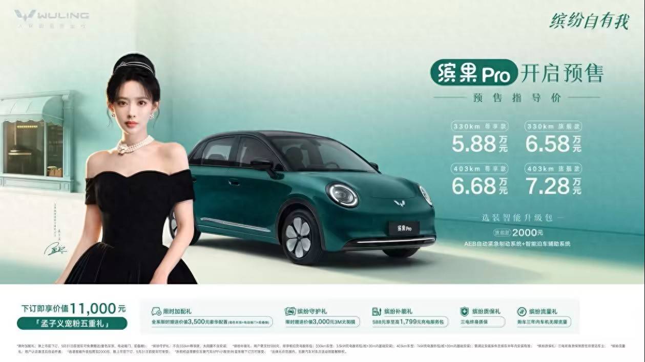4月14日,上汽通用五菱正式宣布旗下全新纯电小车——缤果Pro开启预售。新车定位“精致缤纷座驾”,共推出四款配置车型,预售价格区间为5.88万元至7.28万元。具体版本与预售价为:330km 尊享款 5.88万元、330km 旗舰款 6.58万元、403km 尊享款 6.68万元、403km 旗舰款 7.28万元。即日起至正式上市前下订的用户,可享官方宣称价值11,000元的“孟子义宠粉五重礼”预售权益。新车预计将于近期正式上市。