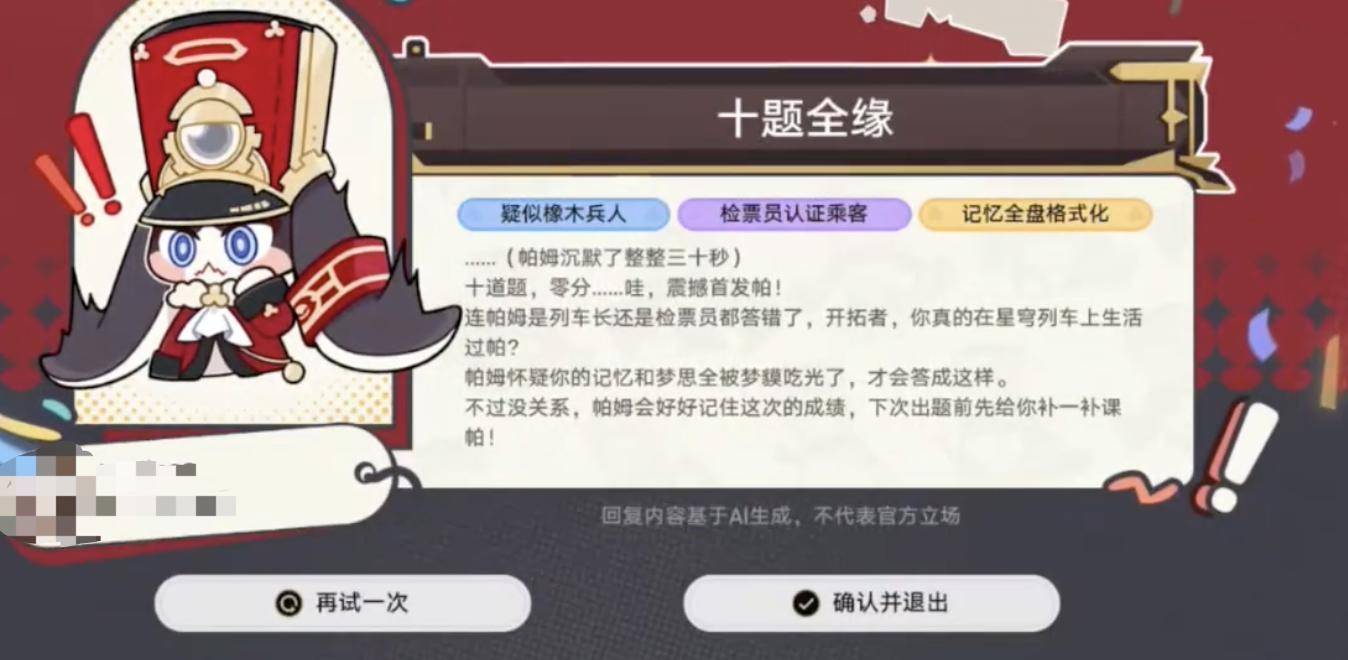 不少玩家为了能全对,还会特意做功课,但也有玩家不走寻常路,故意答错,想看看帕姆是什么反应。结果就是把帕姆都整无语了,整整沉默了30秒,还分析了全错的原因,表示会在下次出提前给开拓者补课,这个列车长也是很负责了。