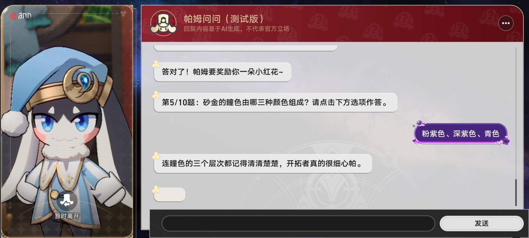 《崩坏:星穹铁道》自从4.2版本上线“帕姆帮帮”功能后,玩家每天上线都会与帕姆AI聊天,沉迷于“调戏”列车长。让人没想到的是,这个功能还会迎来进化,这周新增了“帕姆问问”环节,列车长会给玩家出随机10道游戏相关的问题,玩家参与答题可以获得列车长送出的50星琼。